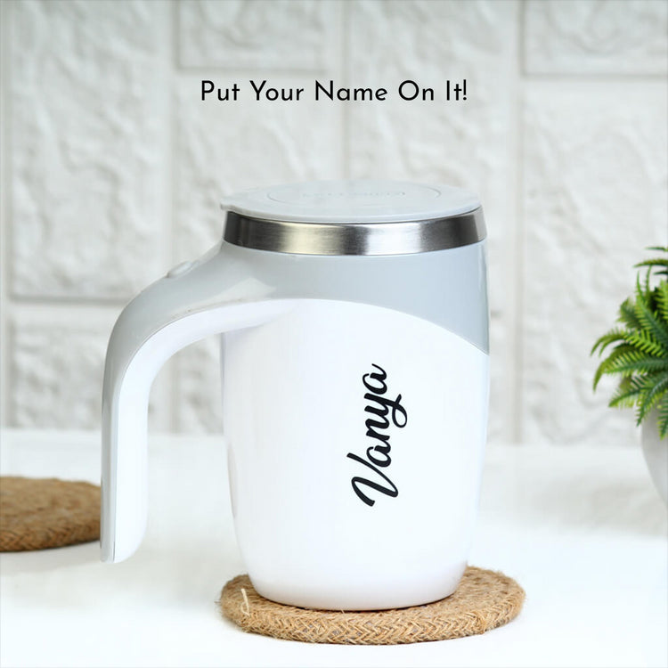 The design of the self stirring coffee mug is stylish and modern, with a secure lid to keep your drink hot or cold for a long time. You can personalize your automatic coffee cup by adding a name or message to make it extra special and enjoy your drinks more often or every day with the Automatic Self-Stirring Mug.