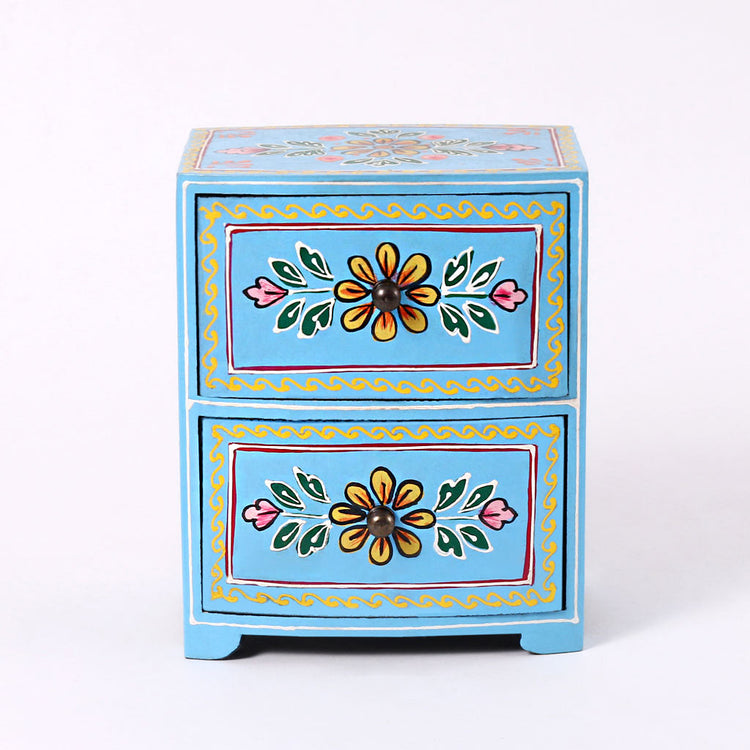 This beautiful wooden box features colorful hand-painted floral designs. It features two small drawers that are ideal for storing jewelry, keys, or other small items. Made from strong, solid wood, it’s built to last and helps keep your things organized. Handcrafted by skilled Indian artisans, this box blends traditional art with modern usefulness, making it both decorative and practical.