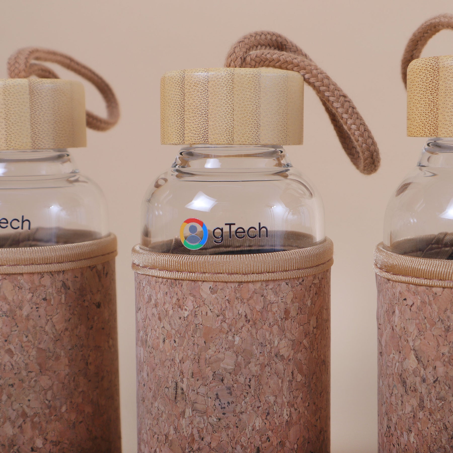 Borosilicate glass water bottle features a bamboo lid, a cork sleeve for a perfect non-slip grip, and a strap for portability.