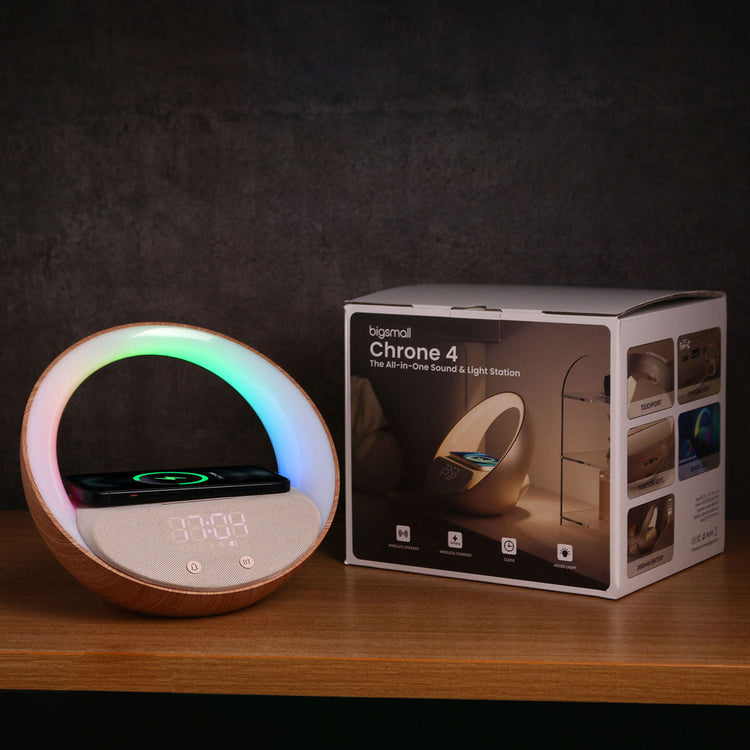 The Chroné 4 All-in-One Station combines a digital clock with dual alarms, wireless Qi charging, Bluetooth audio, and soothing nature sounds with a sleep timer. Its adjustable night light, touch controls, and durable ABS-PC build make it perfect for any bedside or desk. Powered by a 2400mAh battery with USB-C.