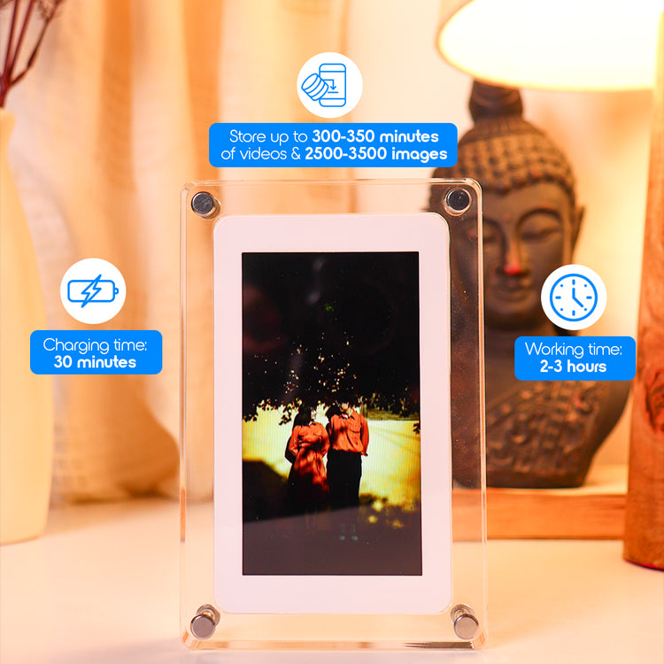 Framing a video with its sound seems like an impossible dream, right? Wrong! With our digital photo and video frame, you can not only frame videos but also play music with your photos and easily change photos with your phone. This digital photo frame blends technology and emotions perfectly, giving you something you can cherish forever! This digital wall photo frame looks sleek and minimalistic, making it a unique addition to your home. You can place this in your bedroom, showcasing your favourite pictures and videos with music, for a romantic night.
