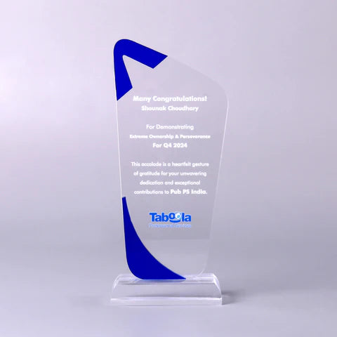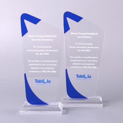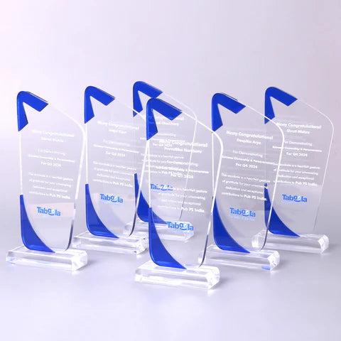 A sleek and modern crystal acrylic trophies with bold blue accents, designed to recognize exceptional employee performance. These awards feature a contemporary, asymmetrical design with a clear finish and a sturdy base, making them perfect for corporate recognition ceremonies. The etching includes a personalized congratulatory message, the recipient’s name, the reason for recognition, and the company branding.