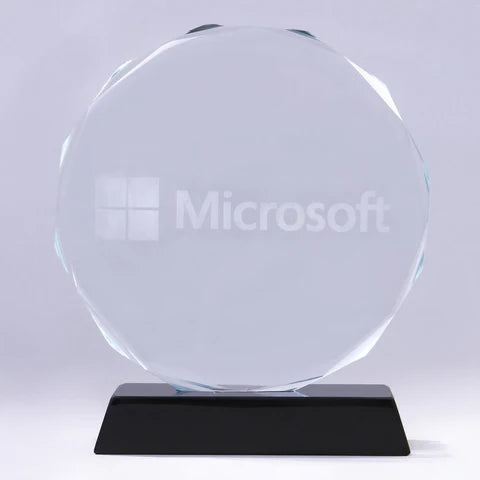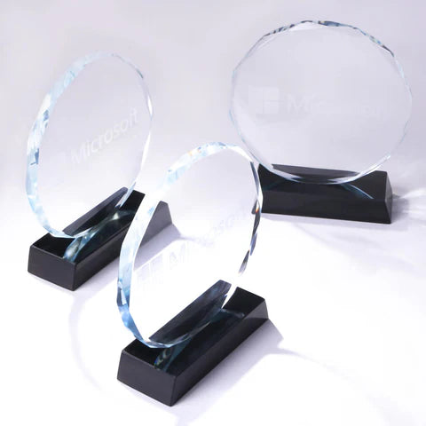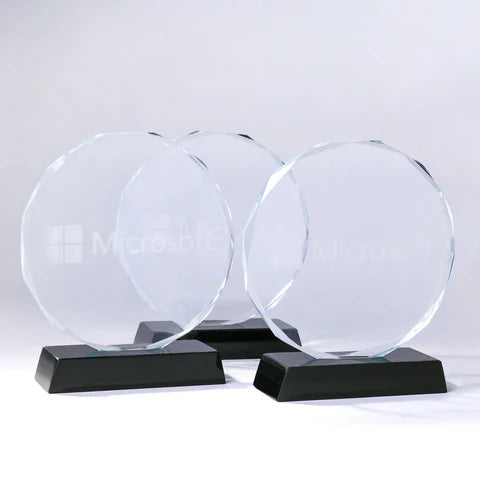 Celebrate excellence with this elegant round crystal award, perfect for corporate recognition. Featuring a beveled circular design mounted on a solid black base, it exudes professionalism and timeless style.