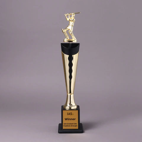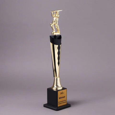 Celebrate sporting excellence with this stylish cricket trophy. Featuring a dynamic batsman figure at the top, this trophy stands tall on a sleek gold-finish column and a black base with a custom engraving plate. It’s a perfect reward for winners, top performers, or cricket-themed events.