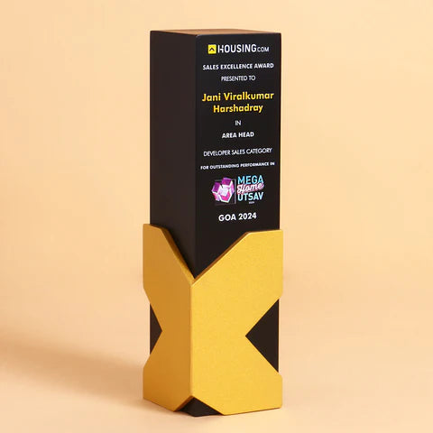 A bold and contemporary award designed to make a statement. This tall rectangular trophy features a matte black body with a striking metallic gold "X" wrap-around element, symbolizing excellence and impact. Perfect for high-performance recognition in sales, leadership, and corporate success.