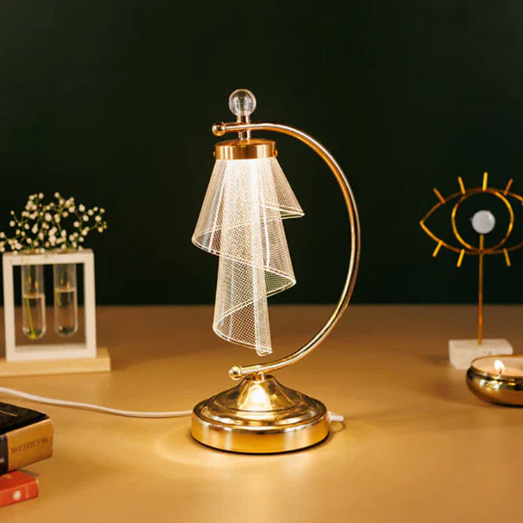 This elegant and modern lamp features a captivating spiral design that creates a mesmerizing 3D illusion when lit. The combination of a golden curved frame and a delicate acrylic shade adds a touch of sophistication to any space. Its warm glow and artistic structure make it a perfect addition to contemporary interiors.