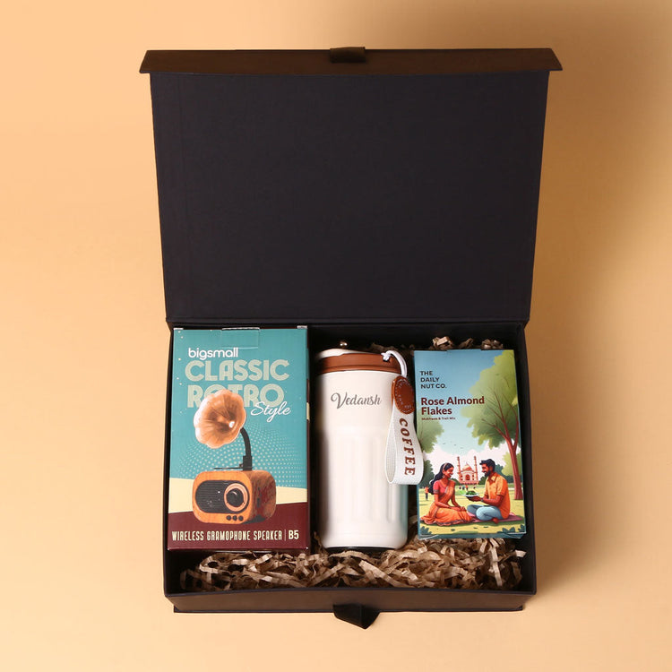 Package Includes: 1 x Vintage Gramophone Bluetooth Speaker, 1 x Personalized Smart Temperature Coffee Mug, 1 x The Daily Nut Co Almonds, 1 x Box