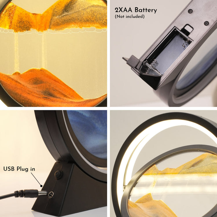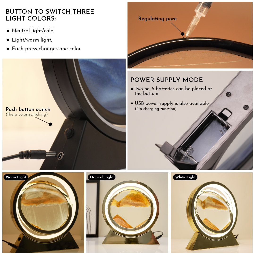 Are you looking for something to calm your nerves? Get ready to add to your collection, a decorative lamp which is beautiful and soothing to look at. It doesn’t get more satisfying than this. The landscape is unlike anything you've seen before. The moving sand art is a round motion frame made of glass with a silicon rim and plastic stand. The 3D glass sandscape has moving and flowing sand inside the frame. You can place this decorative lamp on your desk, bedside, living room or wherever. What's more? It's a lamp! It can't get better than this. Gift it to a friend who loves intriguing room decor.
