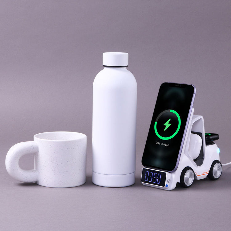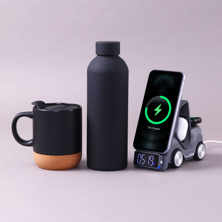 Package Includes: 1 x Chubby Ceramic Coffee Mug, 1 x Double Walled Orange Bottle, and 1 x Charge Cruiser - 3 in 1 Wireless Charger with Clock