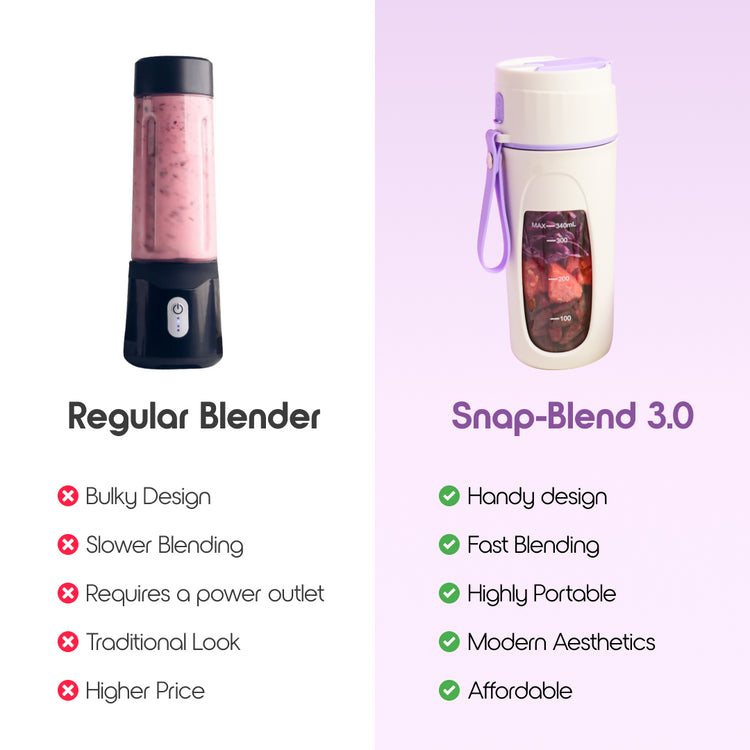 The SnapBlend portable blender is a dynamic, USB rechargeable blender. This is a perfect shake blender for health-conscious individuals. With a capacity of 340ml, it fits perfectly into a bag, making it easy to carry to the office, gym, or outdoor adventures. This small blender comes with sharp stainless steel blades that effortlessly blend vegetables, fruits, protein powders, and ice cubes, thus an ideal blender for smoothies, shakes, juices, dips, and even baby food. Along with a compact design, the vegetable and fruit blender also includes a convenient carry tag and a leak-proof lid. The stylish outer body is built with sturdy food-grade plastic.